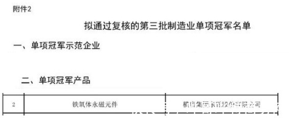 名单共拟认定了118家制造业单项冠军示范企业、141个制造业单项冠军产品。其中,有三家磁性材料公司以不同产品入选,另有一家磁性元器件相关企业,一家生产三层绝缘线相关的母公司入选。